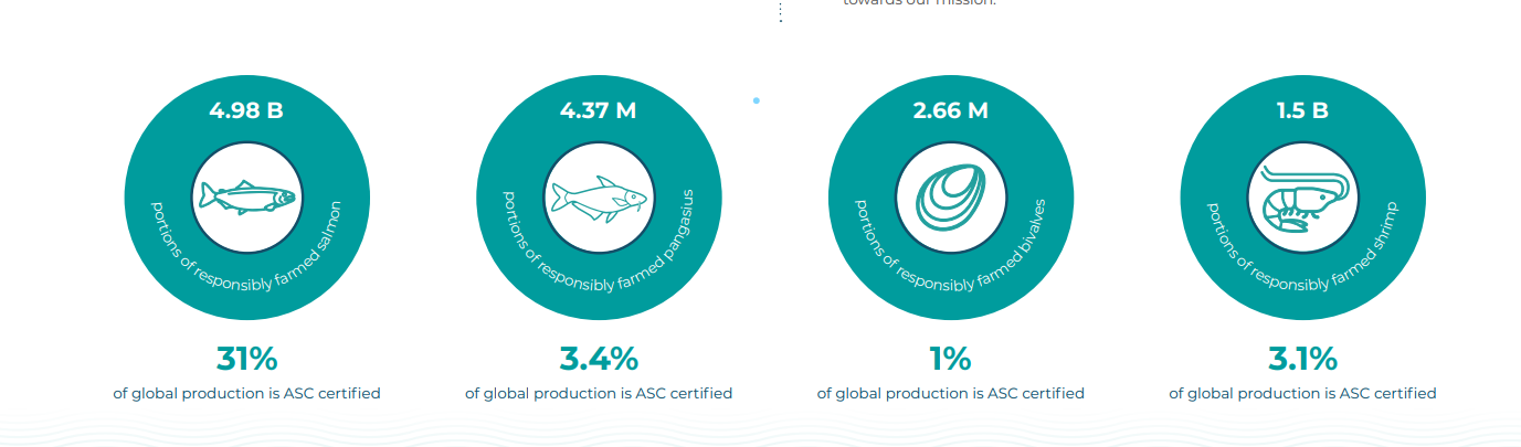 ASC認(rèn)證是享譽(yù)國際、受高度認(rèn)可的水產(chǎn)行業(yè)黃金標(biāo)準(zhǔn)之一 。頒發(fā)自水產(chǎn)養(yǎng)殖管理委員會(ASC),關(guān)注農(nóng)業(yè)對環(huán)境和社會的影響,對水產(chǎn)養(yǎng)殖場加以規(guī)范。目前全球已有2004個養(yǎng)殖場取得ASC認(rèn)證,分別來自49個國家,覆蓋50個物種。