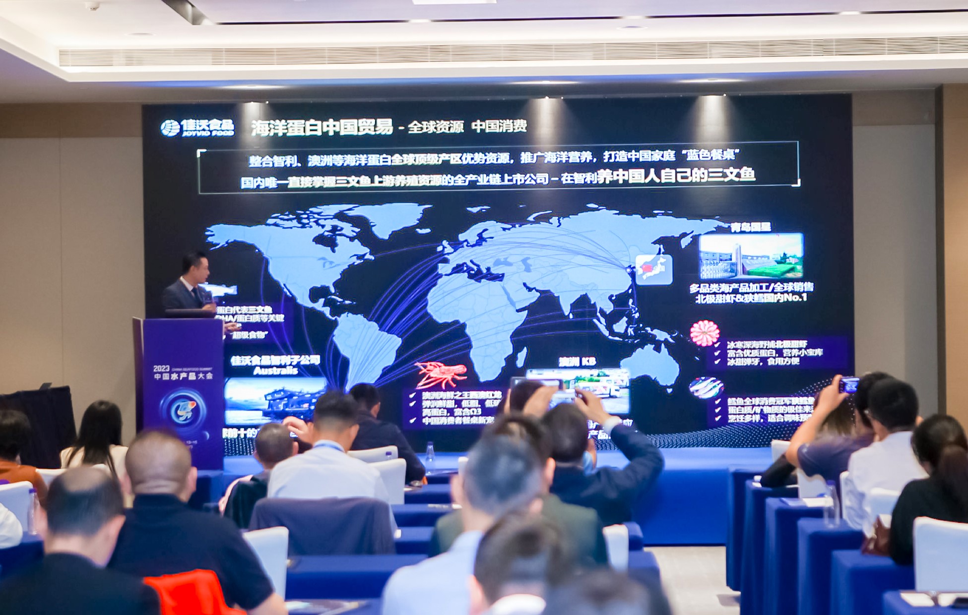 在“大宗水產(chǎn)品國際貿(mào)易與國內(nèi)外市場(chǎng)”的專題研討中,公司大宗銷售運(yùn)營總監(jiān)梁欽垚發(fā)表演講,分享三文魚全球市場(chǎng)趨勢(shì),介紹佳沃食品在全球海洋蛋白產(chǎn)業(yè)的布局及公司為推動(dòng)中國水產(chǎn)行業(yè)大發(fā)展做出的努力和貢獻(xiàn)。