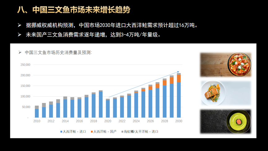 演講中,梁欽垚與與會(huì)行業(yè)伙伴分享了來自國際權(quán)威行業(yè)研究前沿的專業(yè)數(shù)據(jù)。他提到,疫情后時(shí)代,中國市場(chǎng)家庭烹飪場(chǎng)景中的三文魚消費(fèi)占比增長明顯;三文魚作為一種高營養(yǎng)健康食材,正逐漸深入普通家庭的日常消費(fèi)。隨著中國三文魚價(jià)格的理性回歸,未來三文魚消費(fèi)需求將逐年遞增,無論國產(chǎn)三文魚還是進(jìn)口三文魚,都將迎來新的發(fā)展機(jī)遇。
